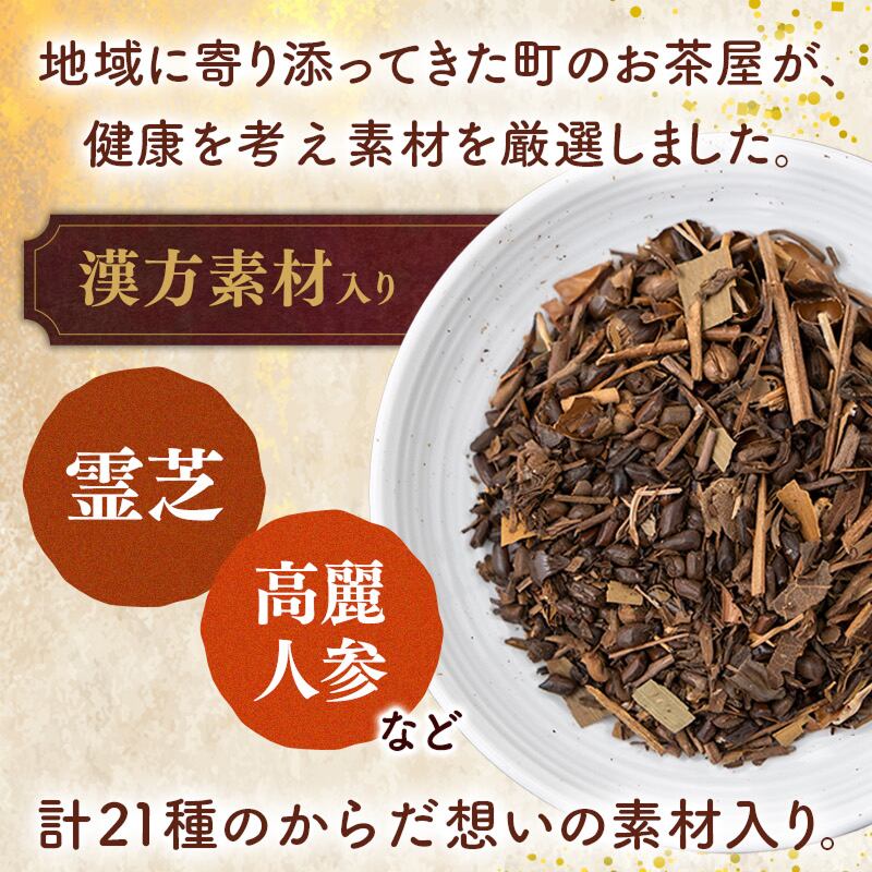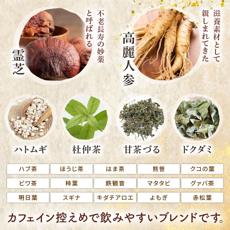 ■原材料名■ ハブ茶、高麗人参、ハトムギ、ほうじ茶、はま茶、ドクダミ、熊笹、甘茶づる、クコの葉、ビワ茶、柿葉、鉄観音、霊芝、マタタビ、グァバ茶、明日葉、スギナ、キダチアロエ、よもぎ、杜仲茶、赤松葉